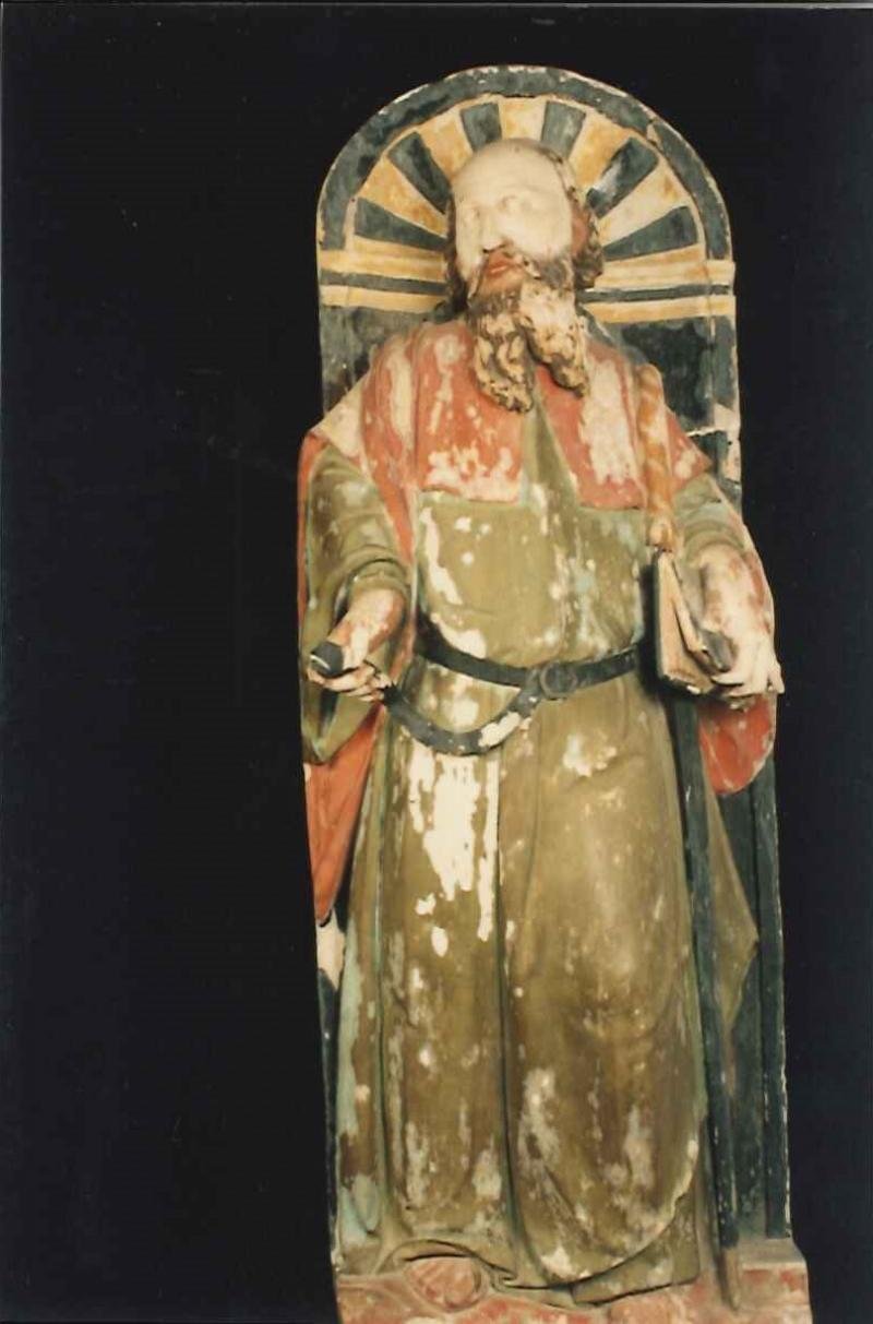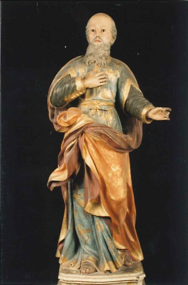 São Pedro destacando-se de um nicho, é apresentado como um homem de idade, semi-calvo, barba comprid...