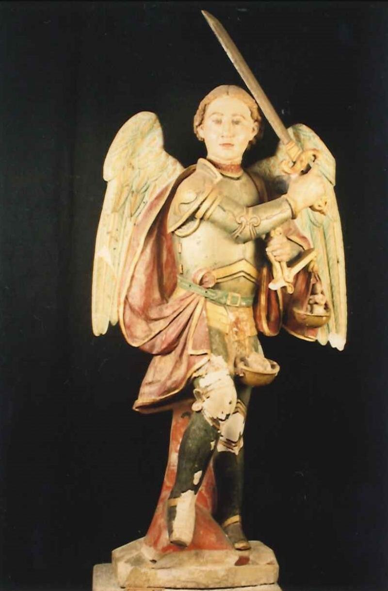 O arcanjo surge sob os traços de um jovem cheio de vitalidade, com uma armadura de feição medieval, ...