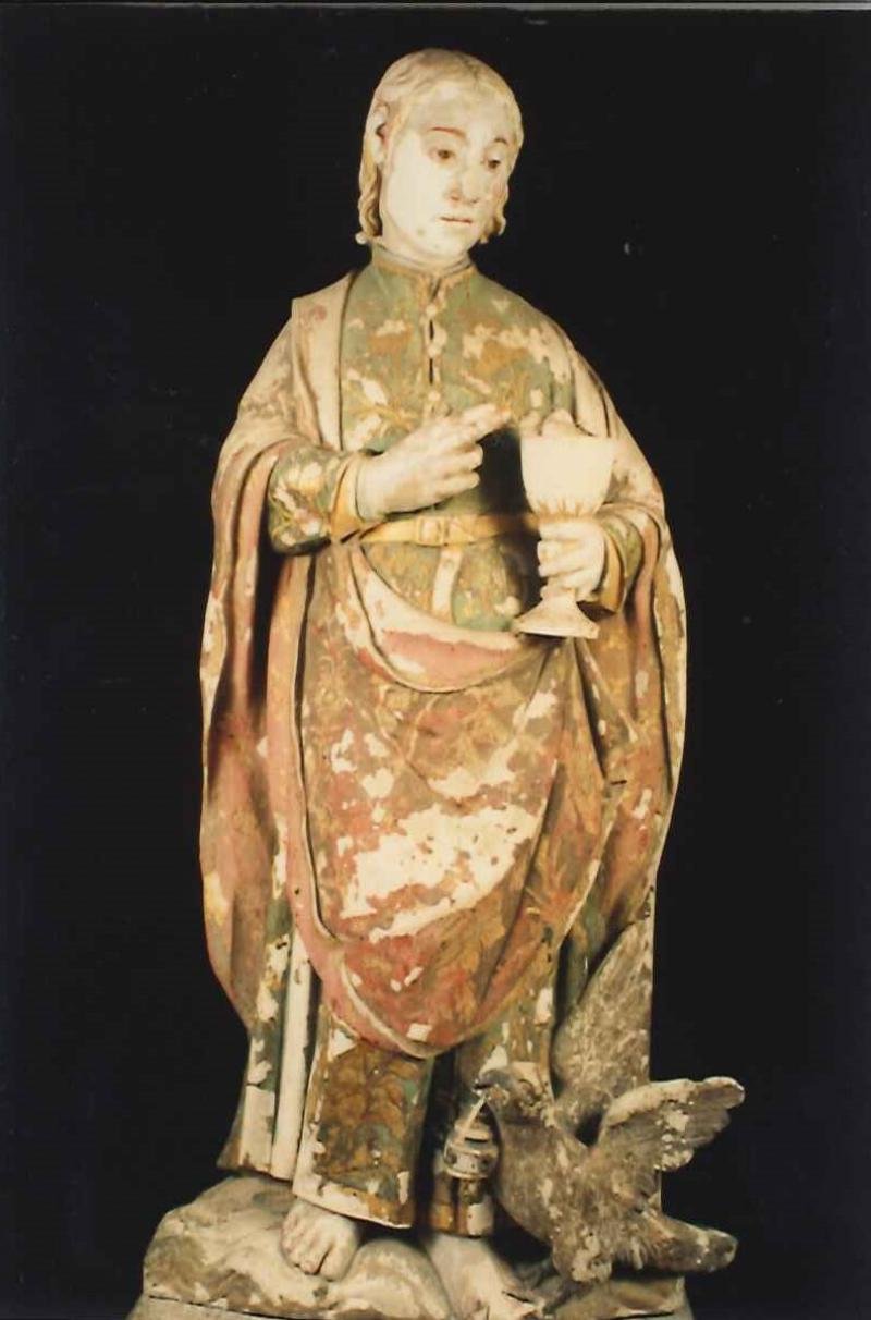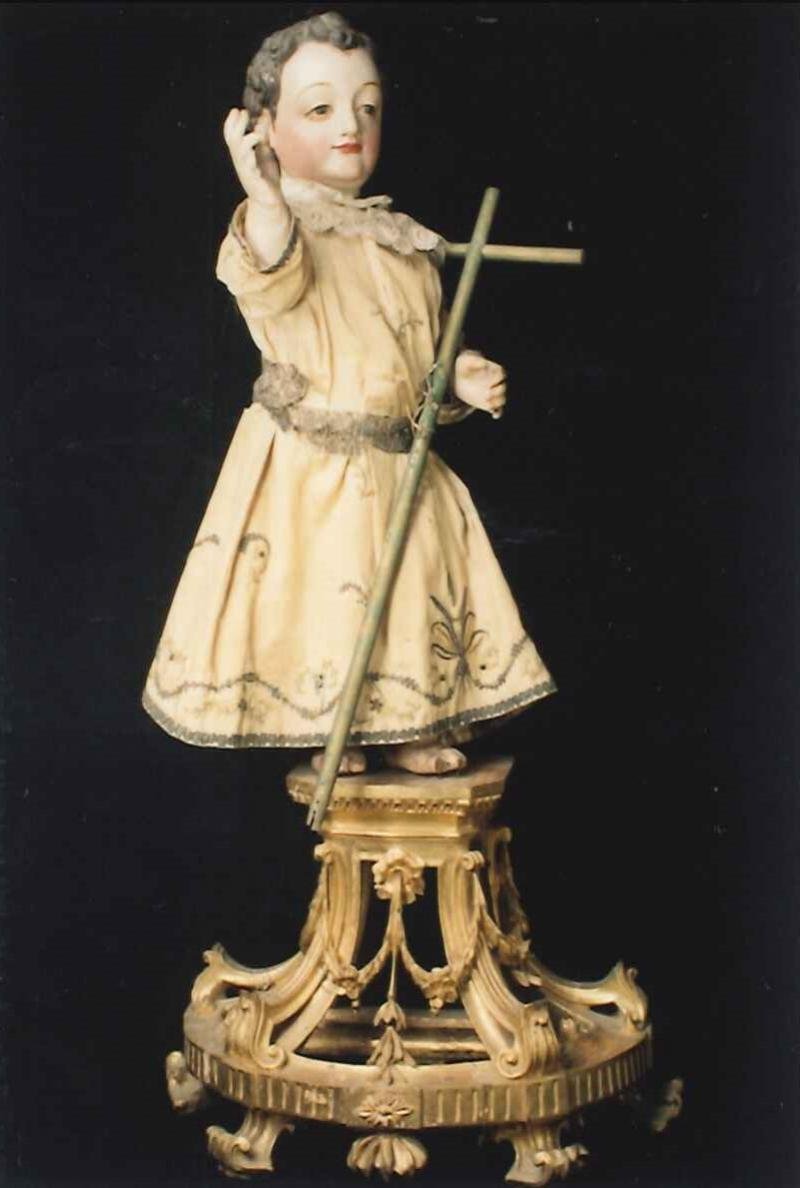 São João é representado como um jovem de cabelos louros compridos, rosto melancólico, trajando túni...