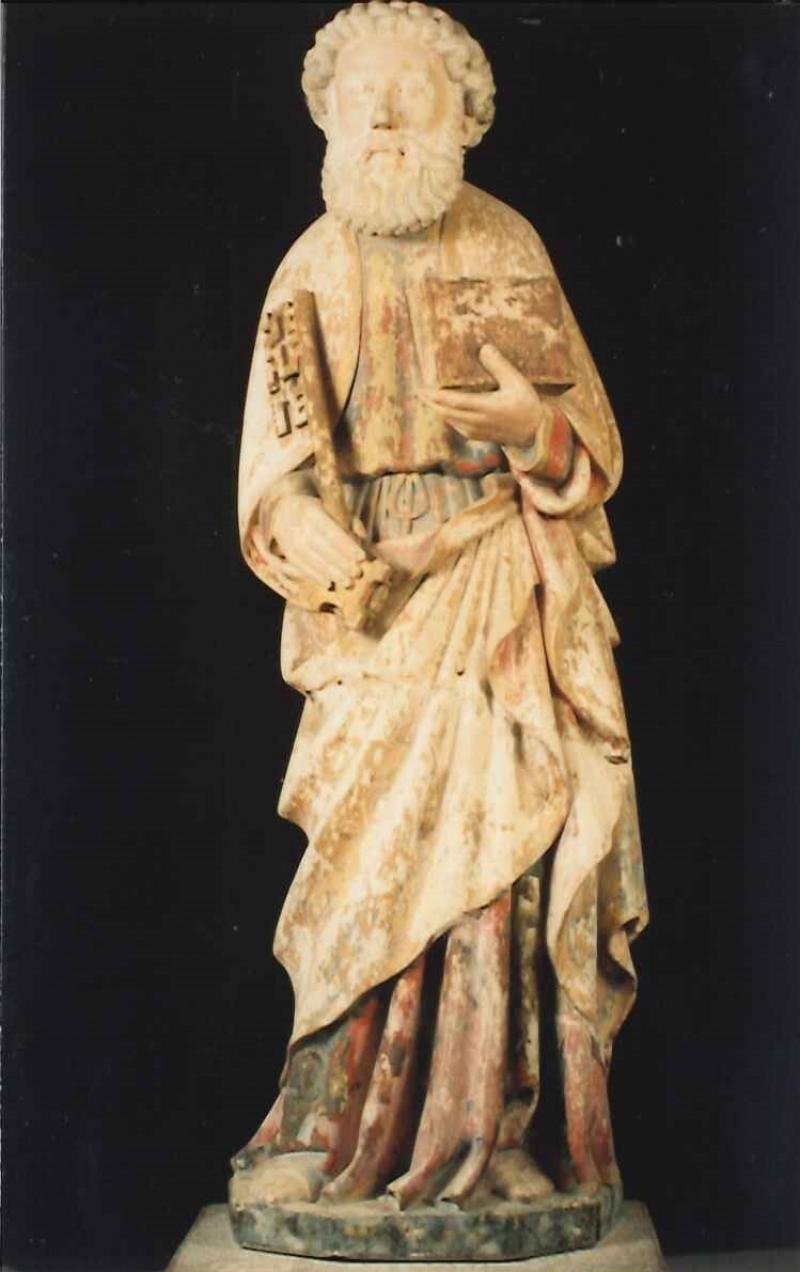 São Pedro é apresentado segundo a tradição : Na mão esquerda, encosta ao peito as Sagradas Escritura...