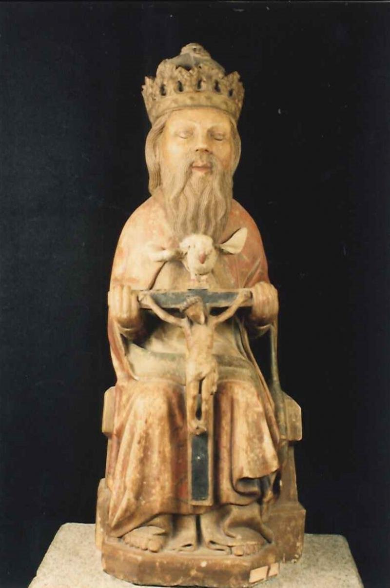 Representação vertical da Trindade segundo o esquema do Trono da Graça, com Deus Pai sob a figura d...