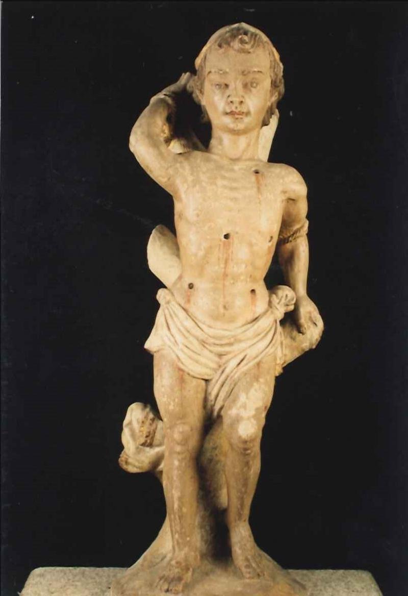 O mártir romano S. Sebastião é representado preso ao tronco de uma árvore, vestindo apenas uma tanga...