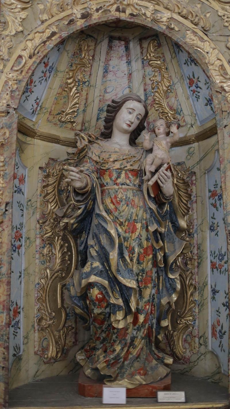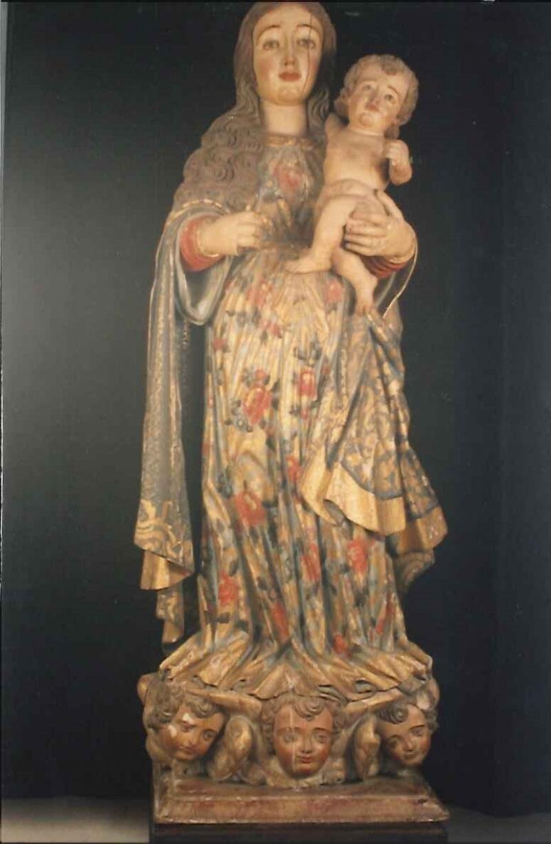 Conjunto de rica policromia com a Virgem trajando manto e túnica, sendo esta de flores em tons verme...