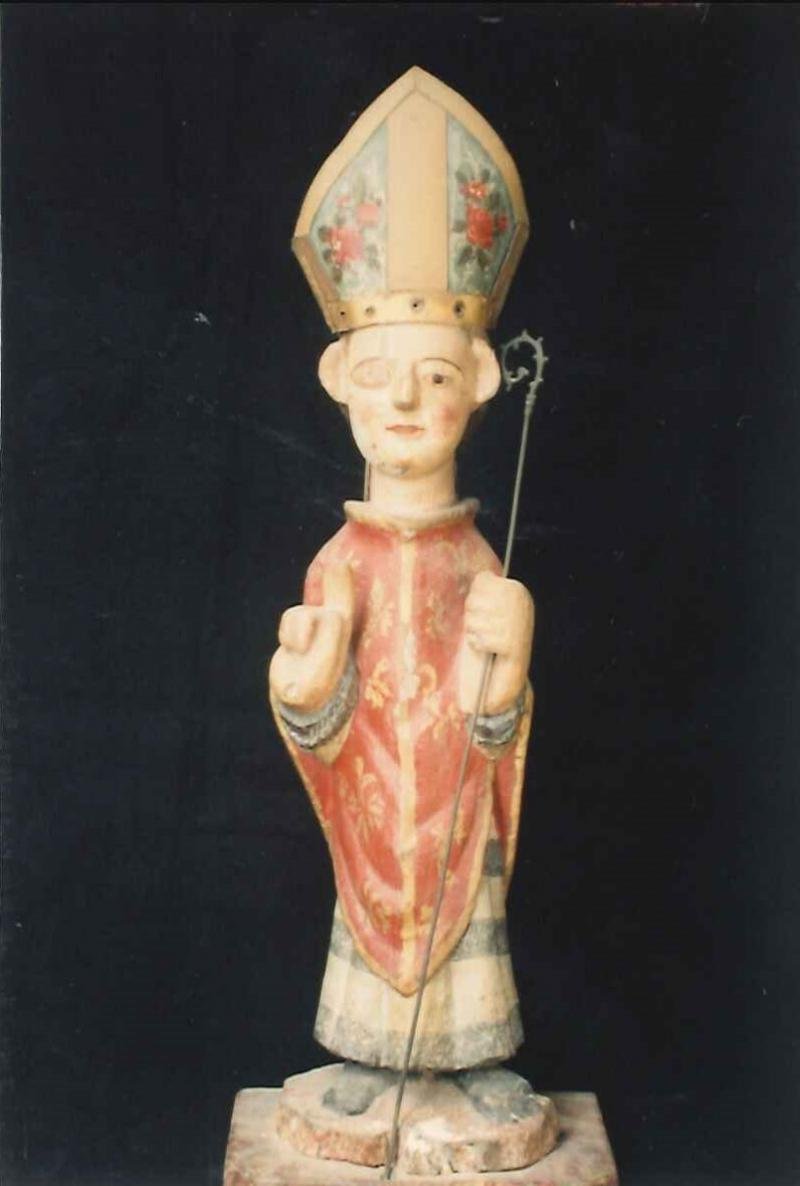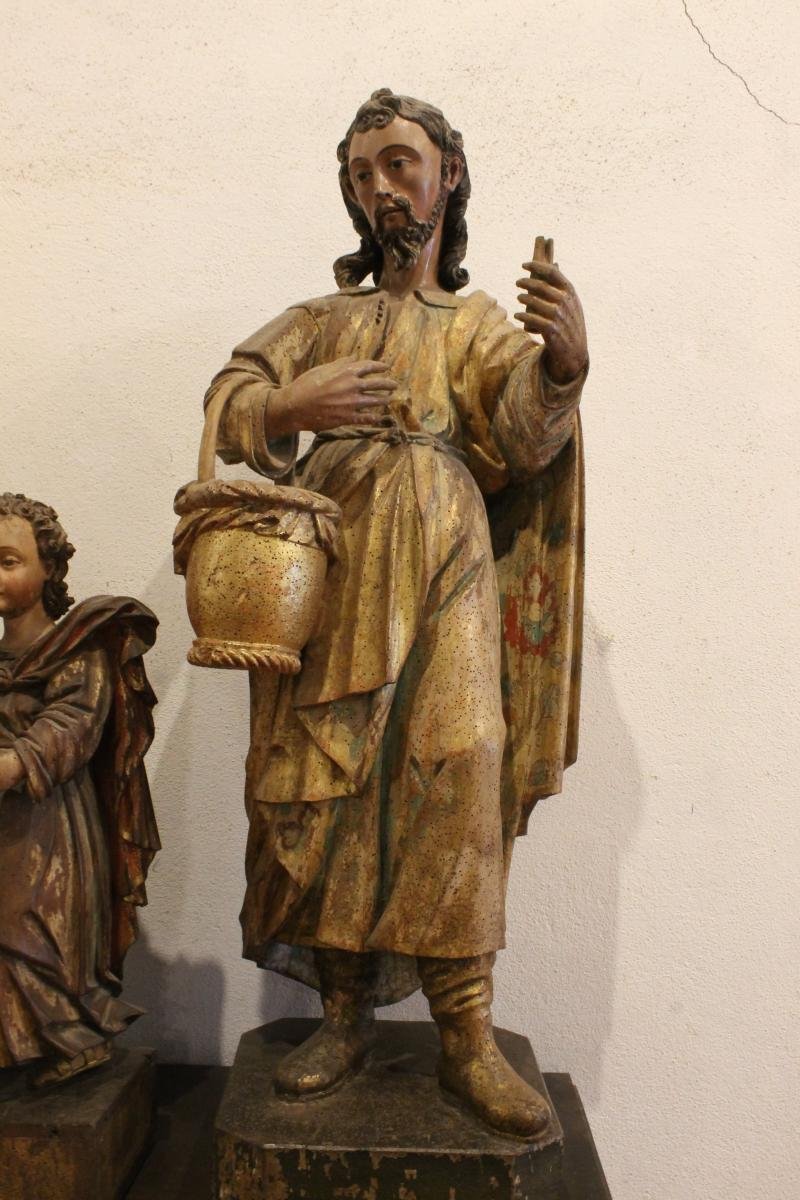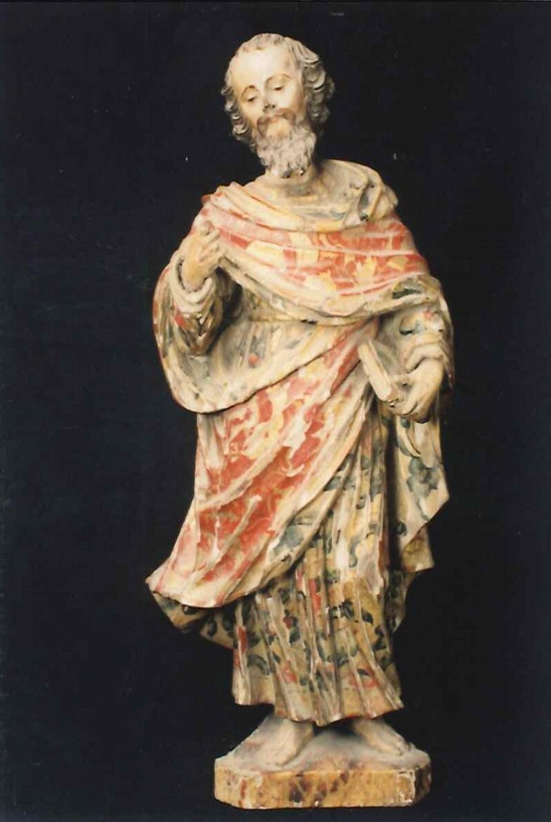 Escultura de vulto pleno representando um santo de cabelos encaracolados, barba comprida ponteagud...