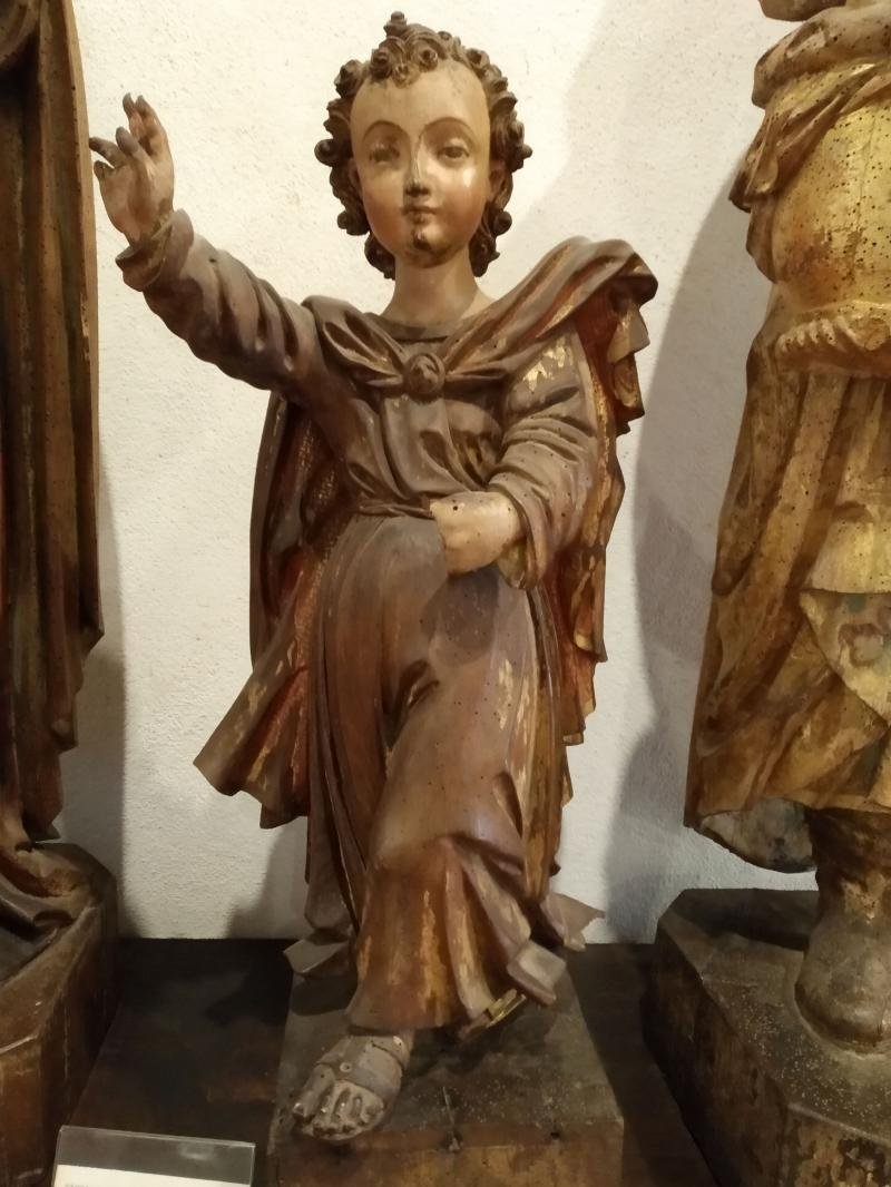 Jesus Menino, de cabelos encaracolados, traja túnica e manto esvoaçante, preso sobre o peito. Jesus ...
