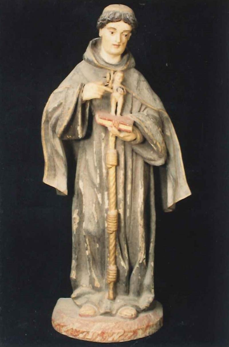 Santo António de hábito, corda à cintura, com dois nós e duas voltas, e capuz pelas costas. Na mão ...
