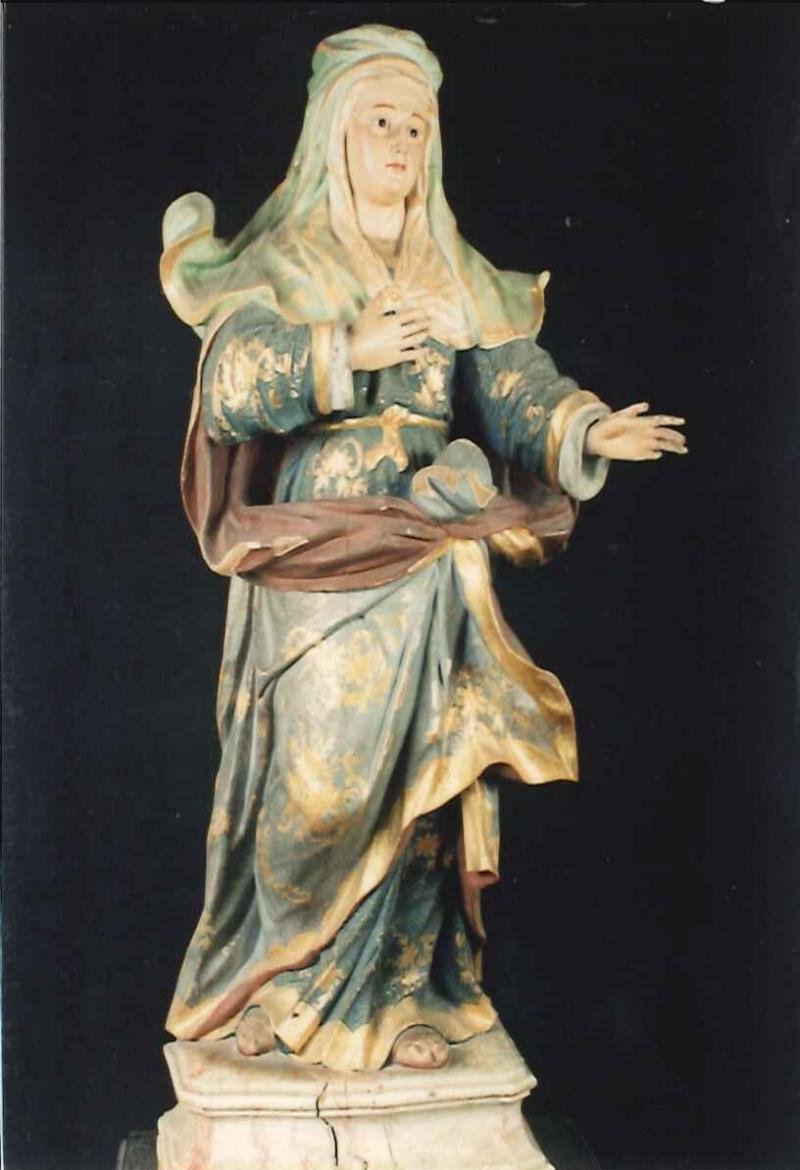 Escultura de vulto pleno representando a mãe da Virgem, trajando coifa verde alteada e véu apertado...