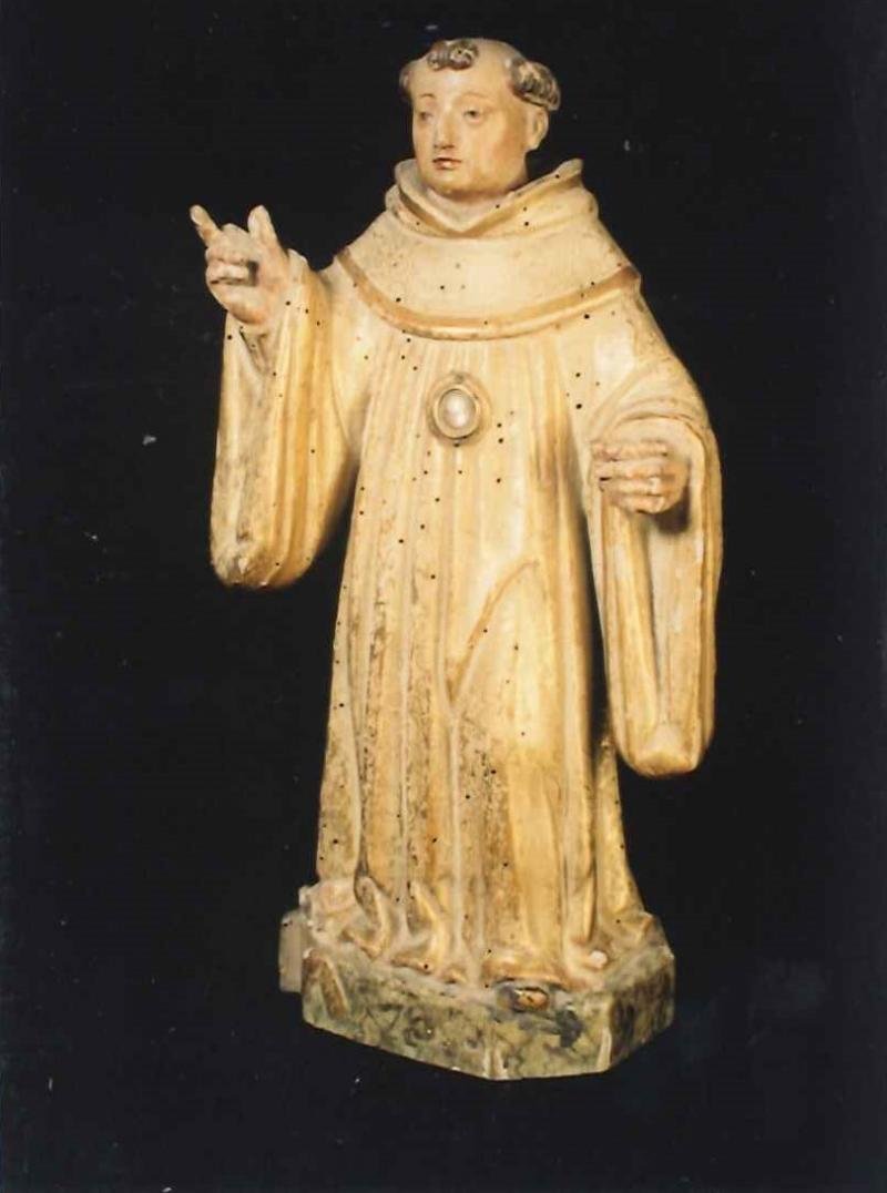Escultura de vulto pleno representando o santo com hábito escuro e cabelo tonsurado. tem uma corda ...